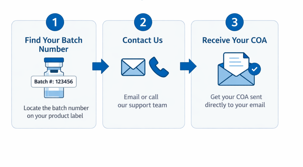 A Certificate of Analysis (COA) provides verified analytical data for each peptide batch, confirming purity, identity, and quality. COAs are generated through standardized laboratory testing and are available upon request.